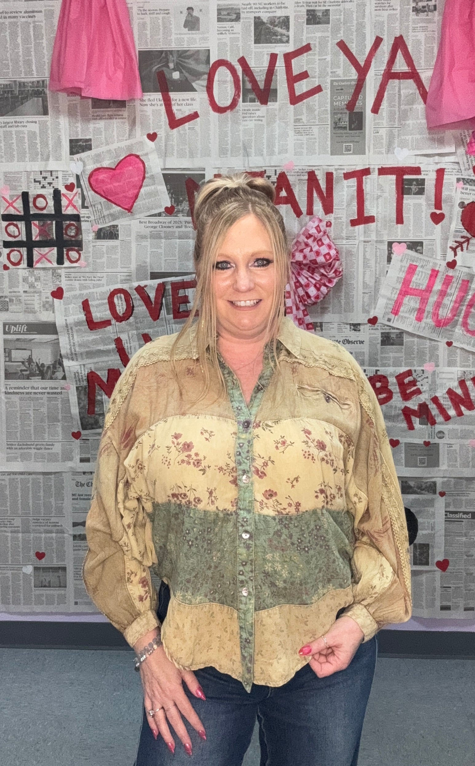 This button-down floral top is all about effortless romance. Featuring dolman sleeves, delicate ruffle details, and a longer back hem, she’s oversized and relaxed for a look that’s soft, flowy, and flattering on every sister. Perfect for pairing with skinny jeans, leggings, or wide-leg pants, this top brings dreamy boho vibes to your everyday wardrobe.