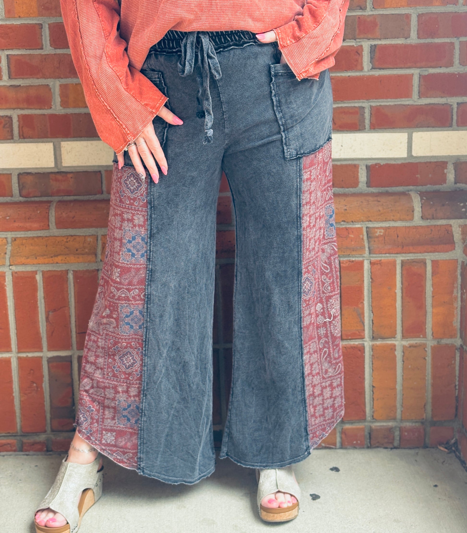 Let your free spirit shine in our Bandana Breeze cropped pants — a little retro, a little boho, and a whole lotta fabulous. These mineral-washed beauties feature a paisley bandana print and an easy pull-on elastic waist for that comfy, carefree fit we all love. The cropped length makes them perfect for warm-weather wanderin’, and the relaxed silhouette flatters every figure.