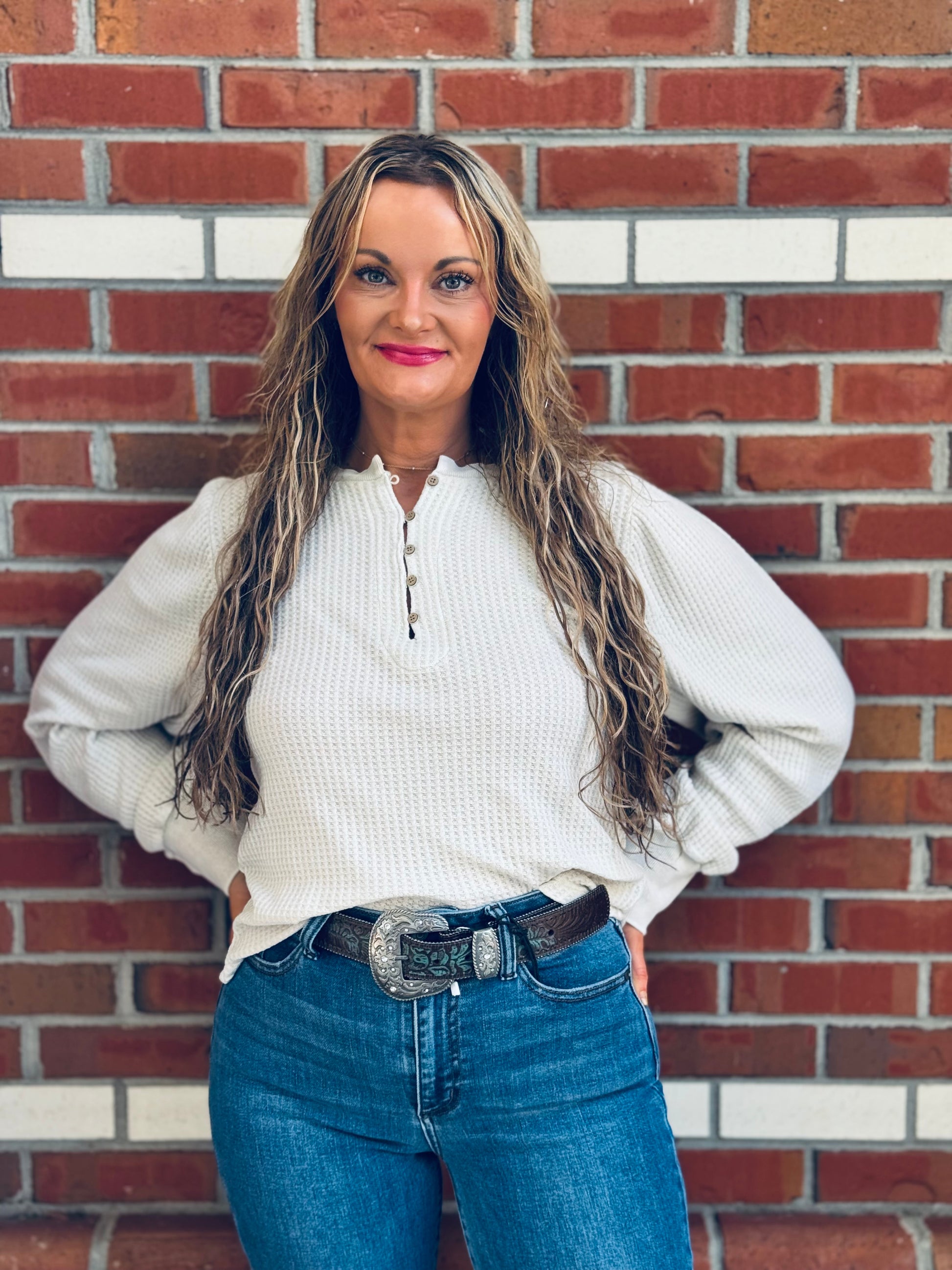 Sisters, this cream mineral-washed thermal top by Easel is FABULOUS for those cozy-chic days! Featuring a soft, lived-in feel, it’s detailed with cute buttons down the neckline and playful button accents on the sleeves for an extra touch of charm. Its relaxed fit makes it perfect for layering with your favorite shackets or wearing solo with Judy Blues and boots. Effortless, comfy, and oh-so-boho—this is a Frankie J’s must-have for fall!