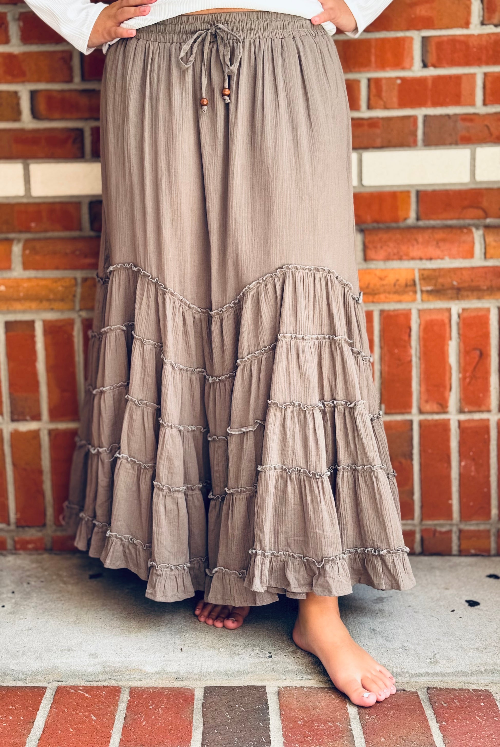 Flowy, fabulous, and oh-so boho — our Earthly Elegance maxi skirt is the definition of effortless style. In a faded olive hue, she features ruffled tiers, an elastic waist with adjustable drawstring, and side pockets for that perfect mix of beauty + function. Fully lined and fitting true to size, this skirt moves with you and keeps you comfortable all day long. Pair her with a graphic tee for casual cool, or dress her up with a chic blouse for a FABULOUS boho look, sister!