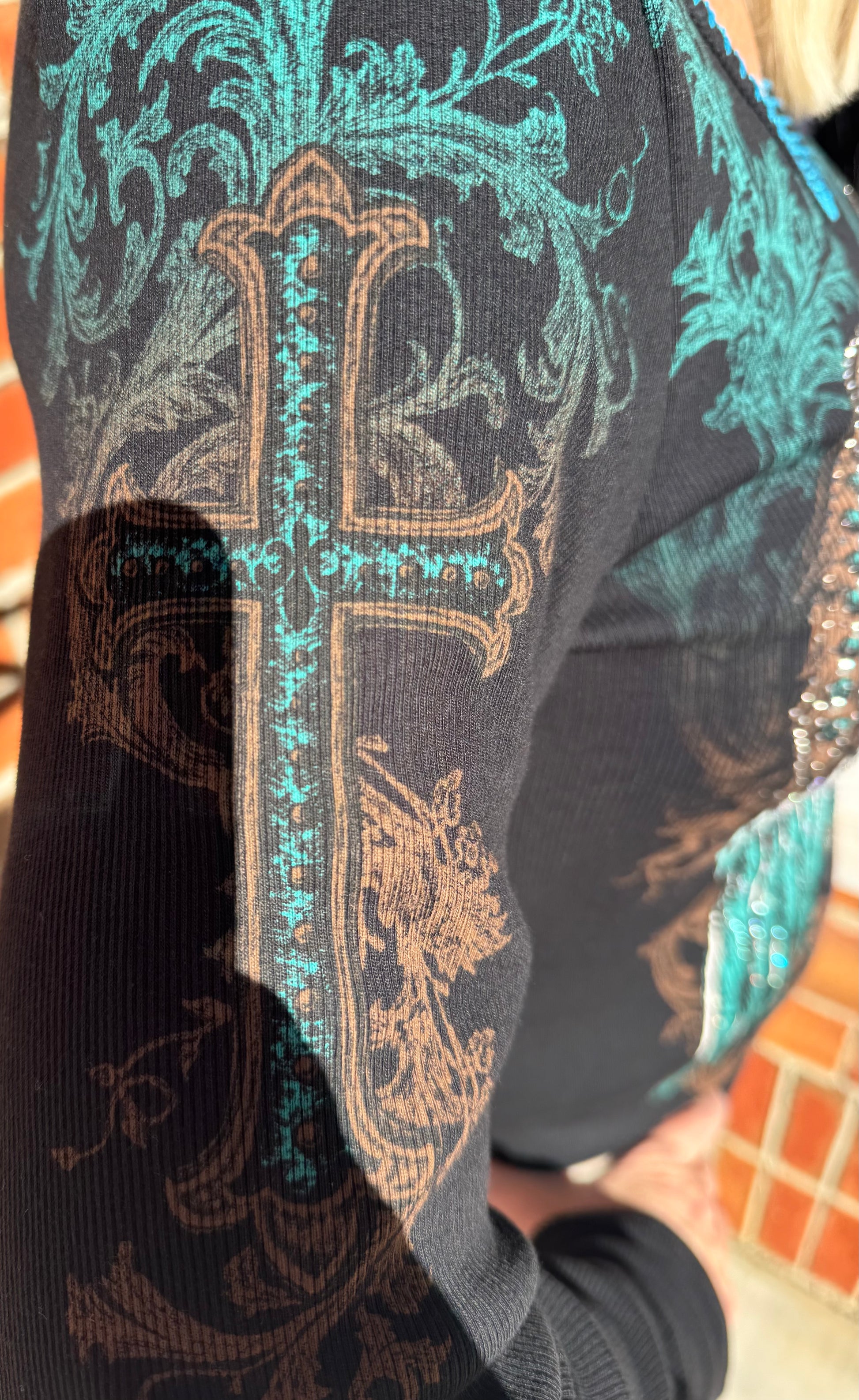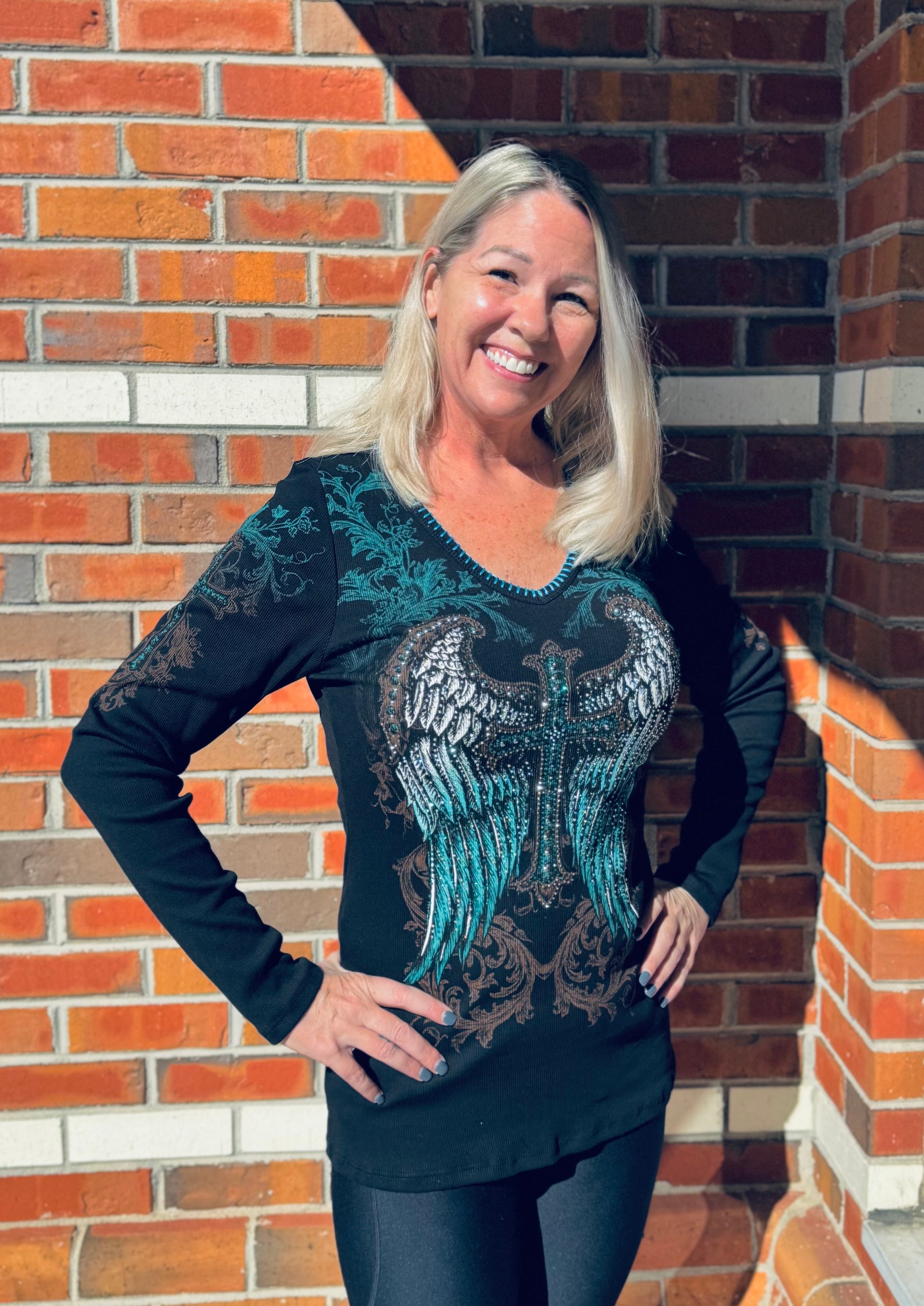 Rock your confidence Faithfully in this stunning long-sleeve knit top from Vocal. Designed with a flattering, form-fitting silhouette, this beauty features a dazzling cross with angel wings and bling for days — even down the arms! She’s bold, beautiful, and made for the woman who shines with faith and fierce style. True to size for that perfect fit, this top will have all eyes on you, sister. 💎🖤