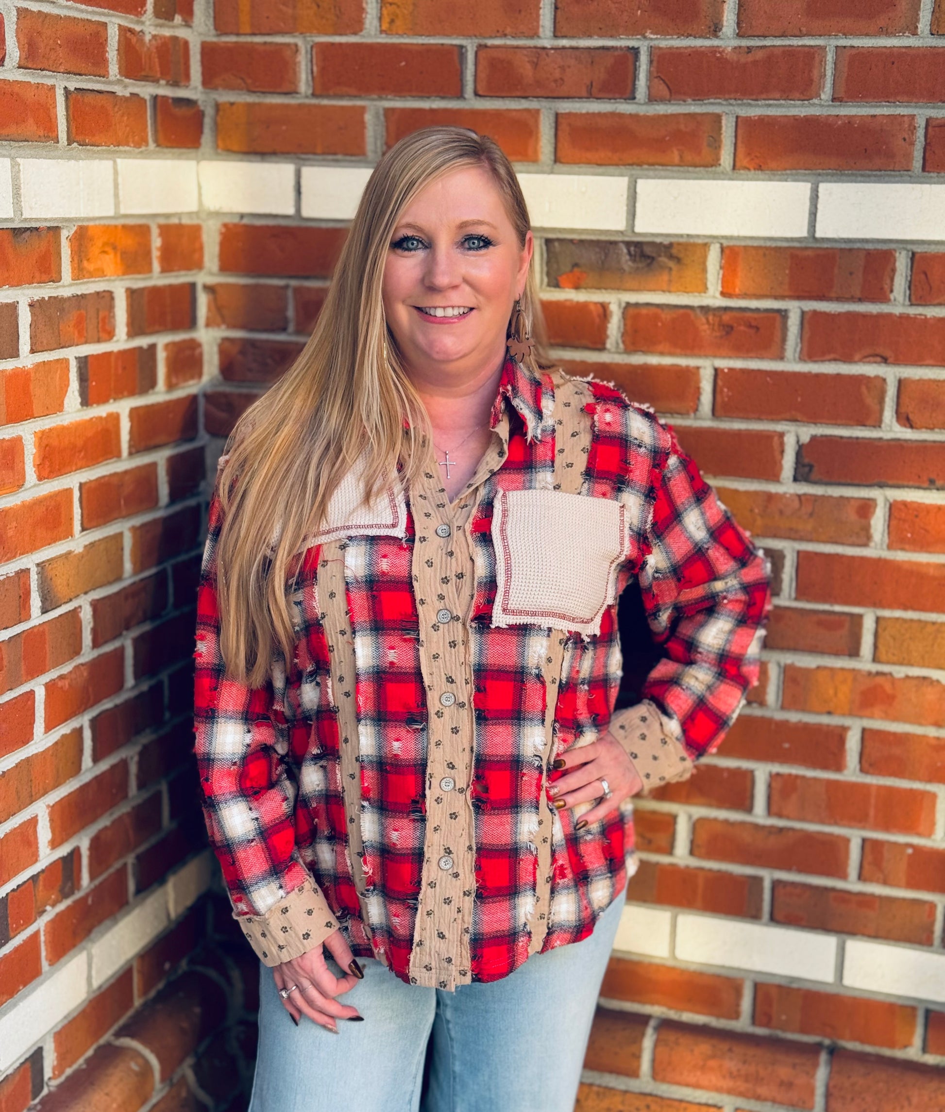 Bring the cheer wherever you go in Holiday Spark — a gorgeous red mixed-fabric POL button-down that’s full of festive charm! With its unique patchwork design and cozy, artsy vibe, this top is perfect for holiday gatherings, layering, or just adding a little sparkle to your season. True to size with that effortless POL fit, Holiday Spark will have all eyes on you, sister, as you twirl through the holidays! ❤️