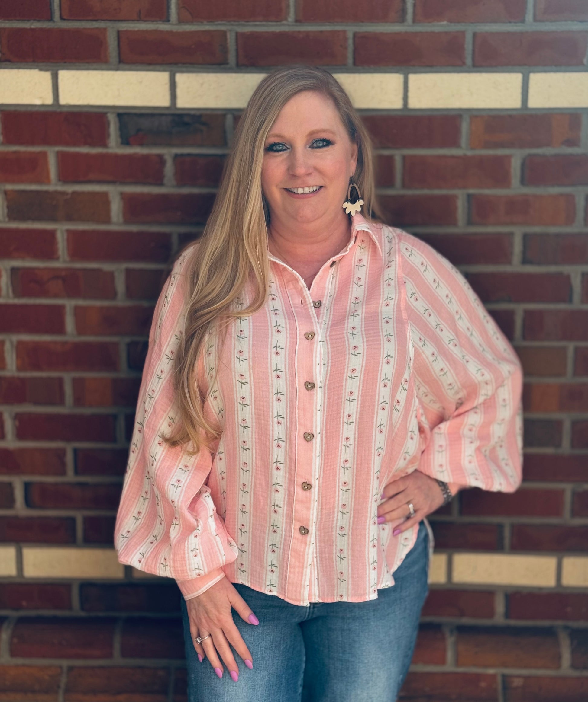 Romantic, soft, and effortlessly charming π The Pink Porch Poetry top by Easel is giving vintage wallpaper dreams with a southern twist. Featuring a crisp white cotton base with delicate pink floral stripes and heart buttons, she has that heirloom-inspired feel that never goes out of style.