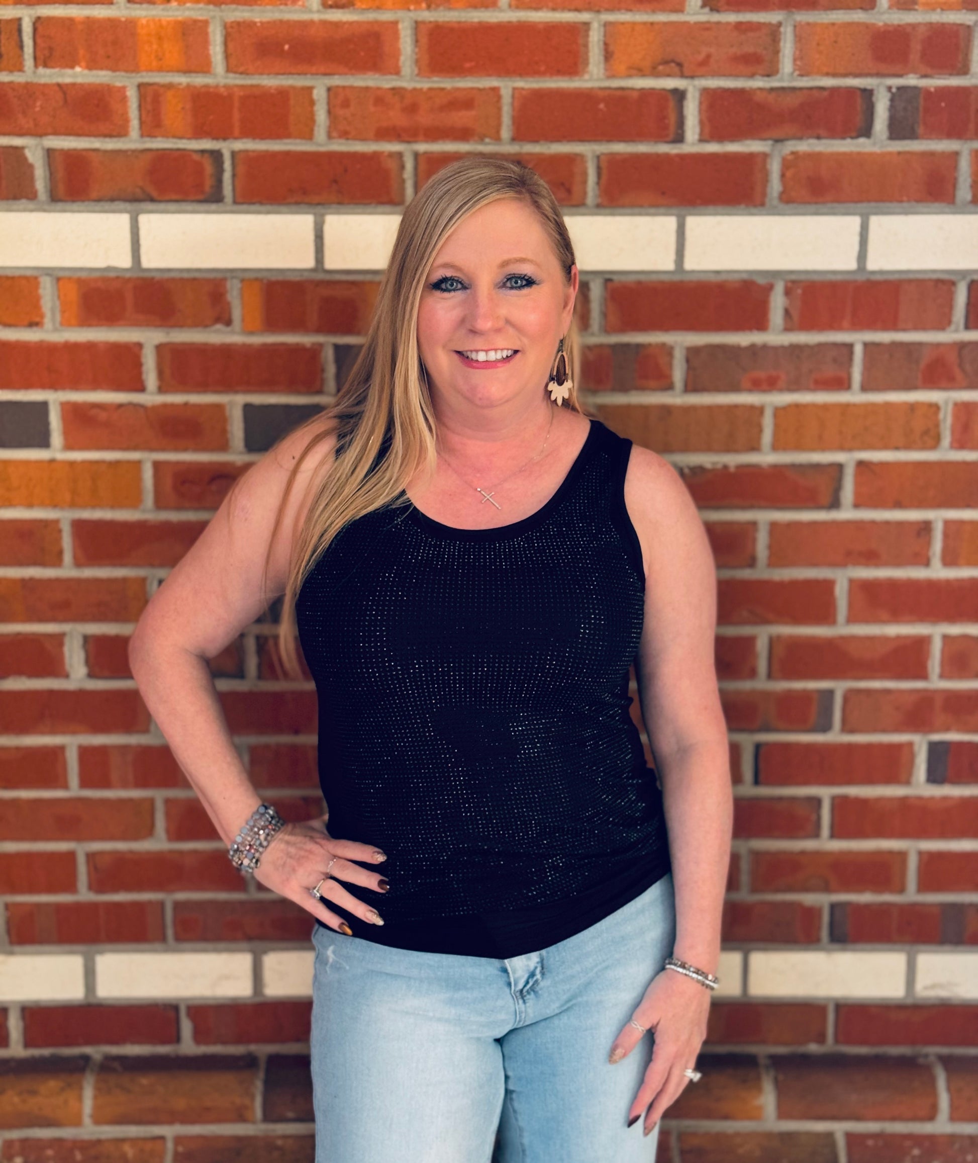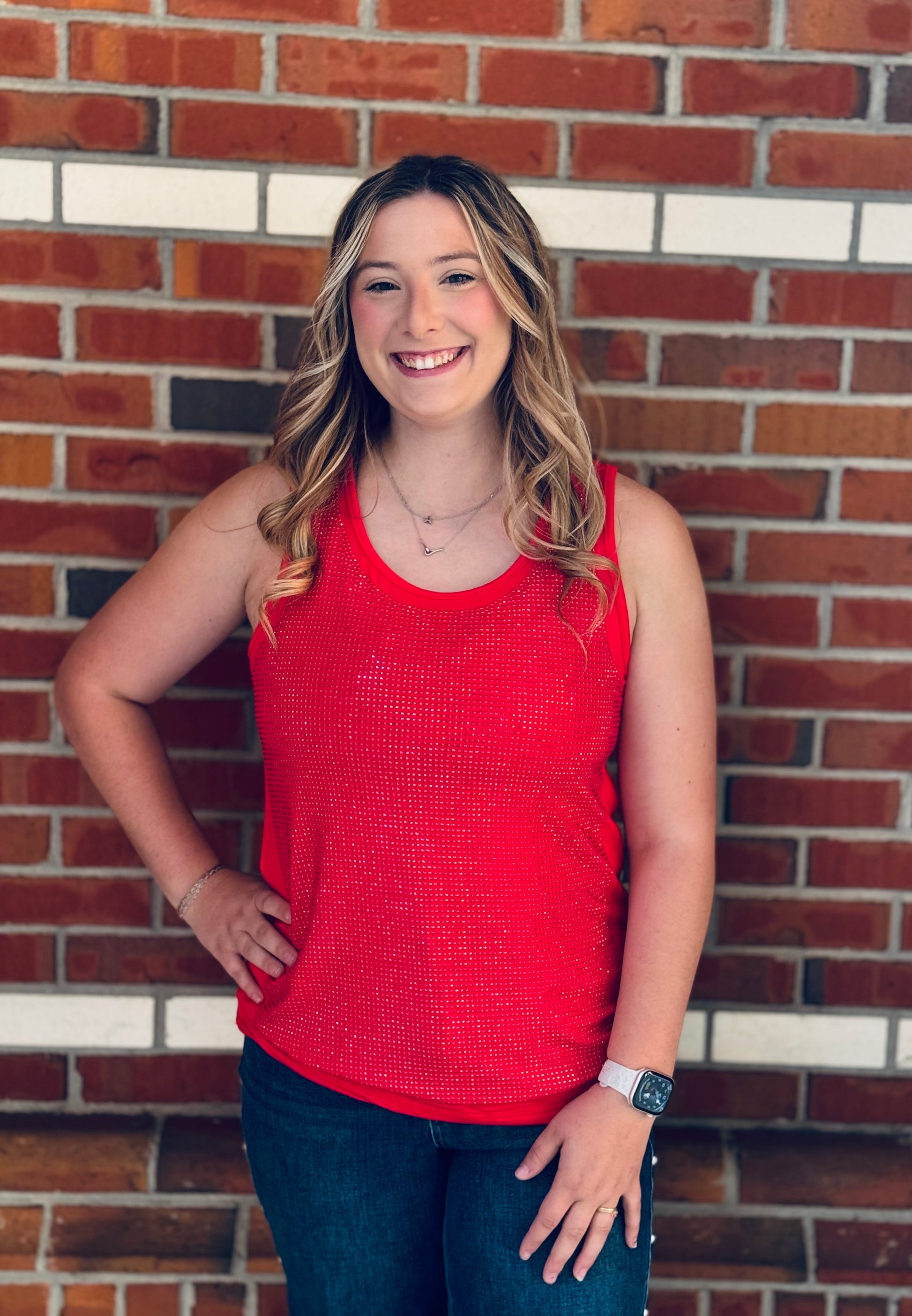 Fall head over heels for Rhinestone Romance β your new favorite layering piece with just the right touch of sparkle! This sleeveless rayon jersey knit tank features a semi V-neckline and rhinestone detailing that shines with every move. Sheβs form-fitting, true to size, and oh-so-flattering β perfect worn solo or layered under your favorite shacket or cardigan. Available in two stunning shades β classic black and red β in sizes Small through 3X. β¨