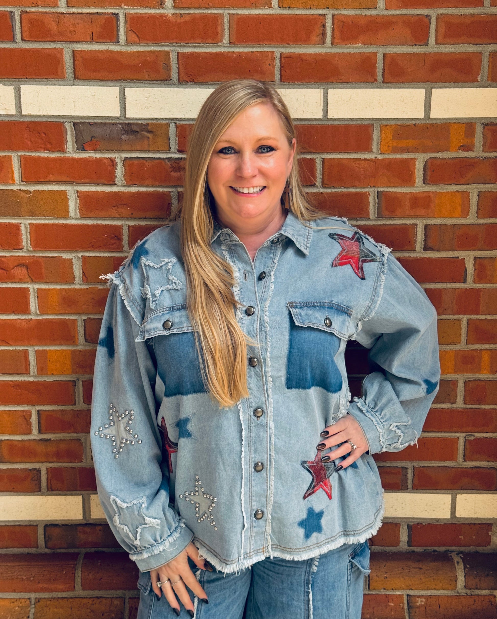 Shine bright in our Rockstar Dreams denim button-down by POL! This statement piece features playful balloon sleeves, star accents, and edgy metal grommets for that perfect mix of boho and rock ’n’ roll. The relaxed fit makes it easy to layer or style solo for a FABULOUS standout look. Tammy is wearing a size small.