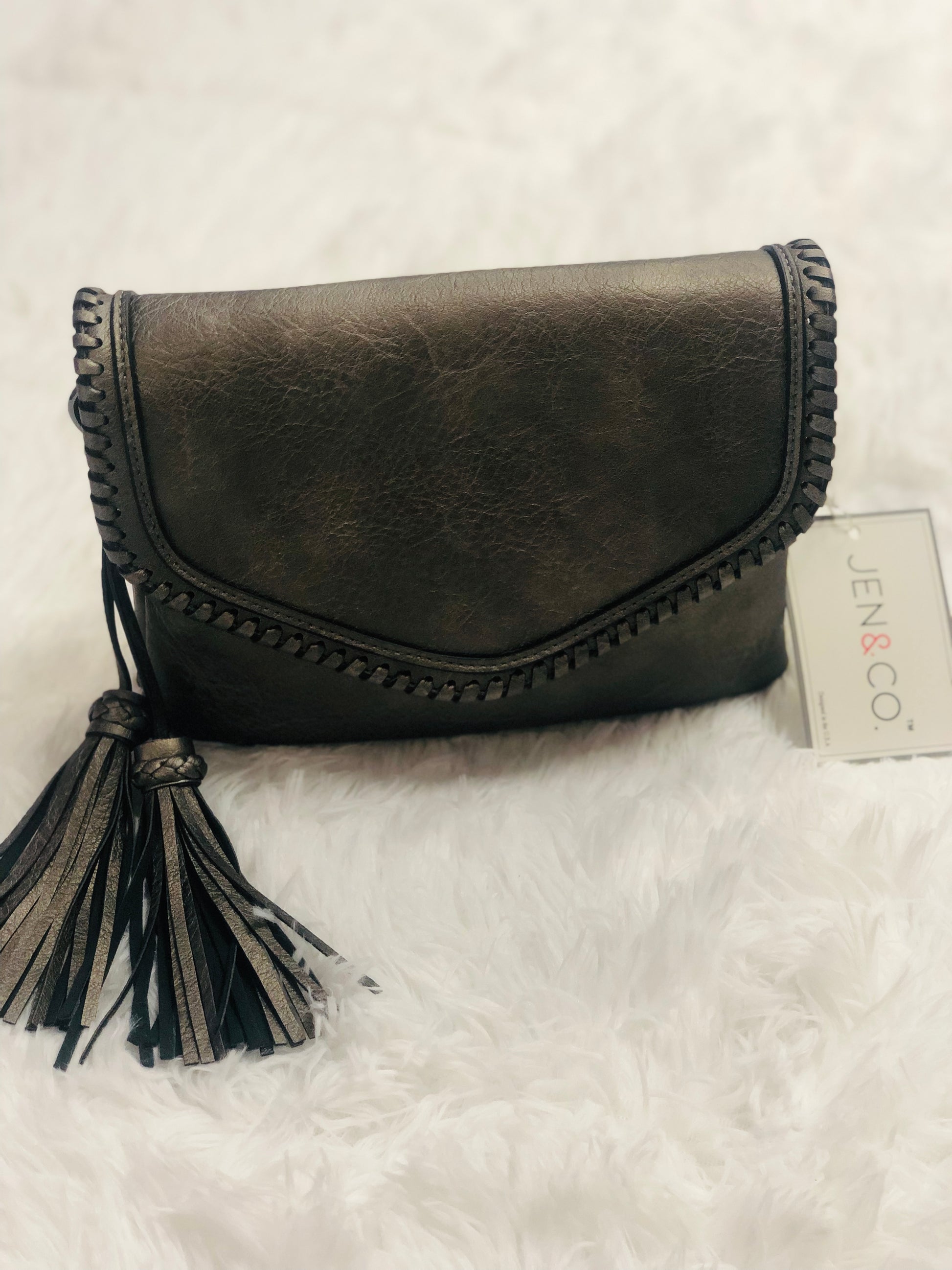 Sloane is one of our go-to crossbodies! This envelope style crossbody/clutch features a whipstitch trim design, a decorative tassel, and an adjustable/removable strap. This two compartment bag closes with a magnetic snap and has both card slots and pockets inside. Dimensions: 9.5"L x 7"H x 2"D