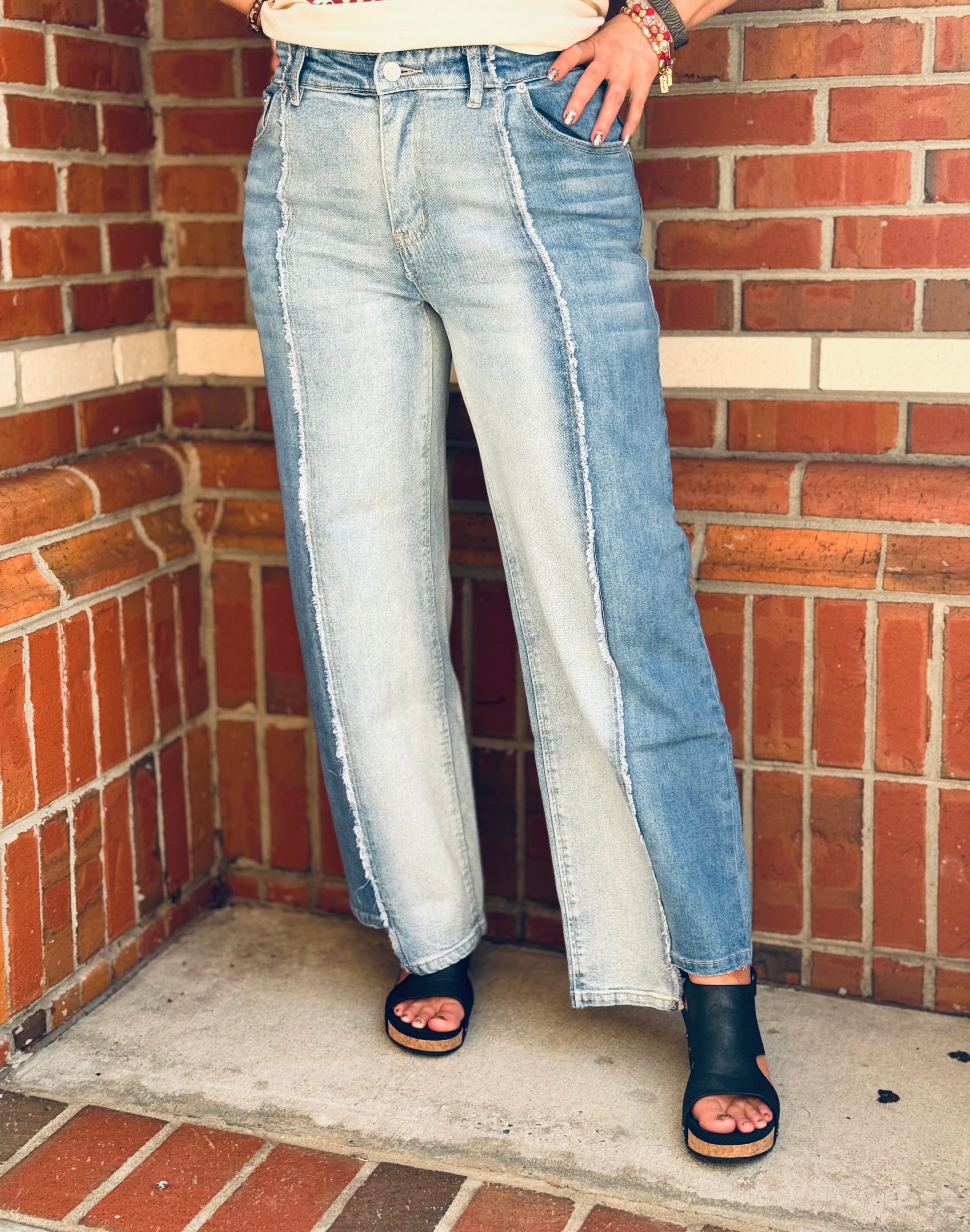 Cool, edgy, and made to stand out — the “Split Decision” High-Waisted Denim by Oli & Hali is a total vibe. These statement jeans feature bold two-tone paneling and light distressing that gives off just the right amount of edge. The high-rise fit hugs you in all the right places, while the straight leg silhouette keeps it effortlessly on-trend.