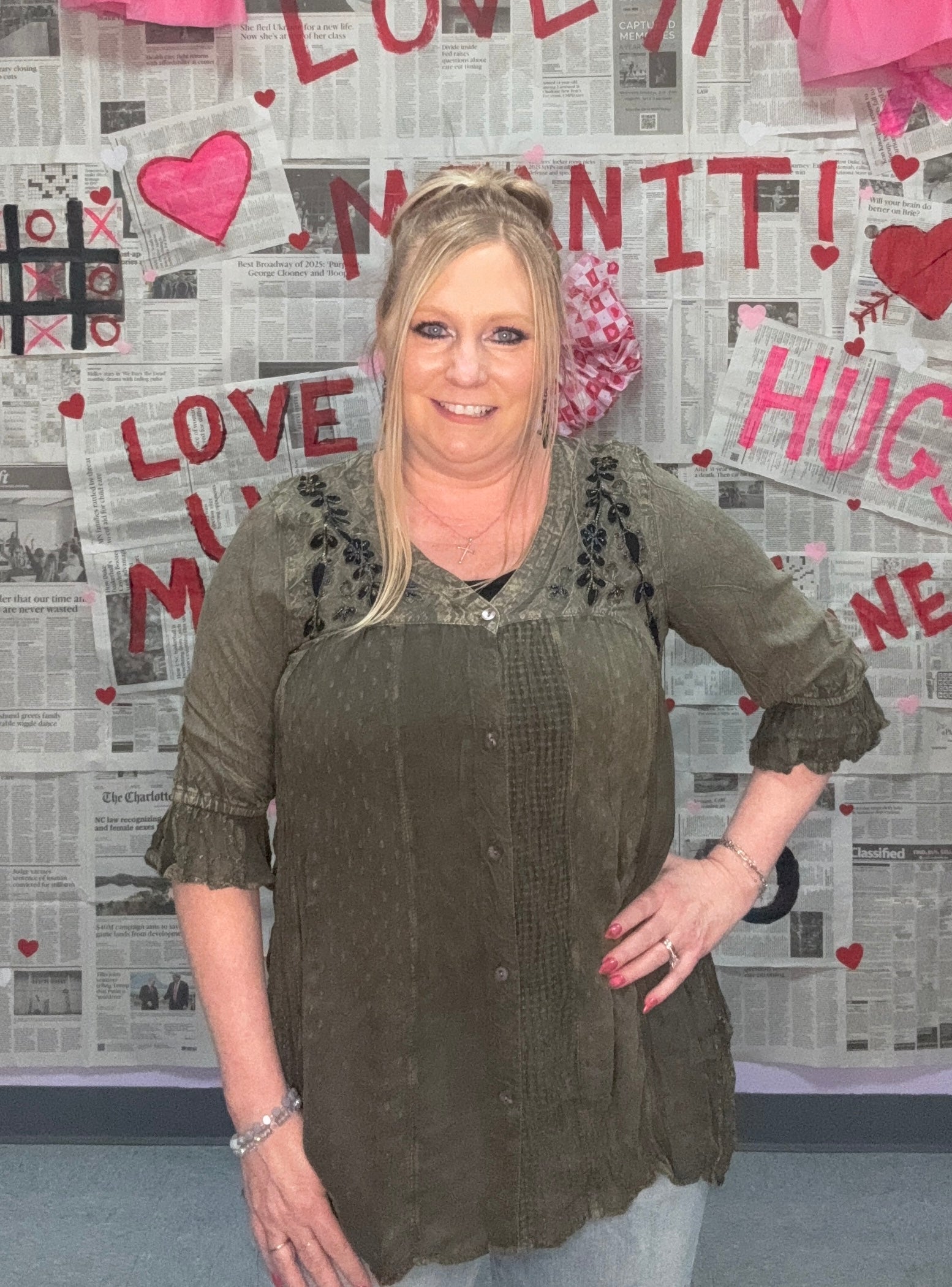 This gravel-colored button-down top is serving all the moody, gypsy-chic vibes. Featuring delicate black bead detailing, a V-neckline, and sheer lace accents, she’s equal parts drama and elegance. The 3/4 length sleeves and relaxed fit make her effortlessly wearable while still turning heads.